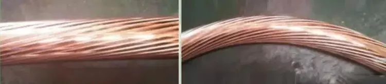 彎曲對導體的影響:電纜導體由多根單芯導線以一定節(jié)距絞合而成,在導體制作過程中導體的單線根數(shù)和節(jié)距大小決定了導體彎曲時的穩(wěn)定性,過大的彎曲將導致導體的松散和突起,直接影響導體外層半導電層和絕緣層的性能。
