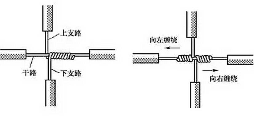(6)同一方向的導(dǎo)線的連接。當(dāng)需要連接的導(dǎo)線來自同一方向時,可以采用圖10所示的方法。對于單股導(dǎo)線,可將一根導(dǎo)線的芯線緊密纏繞在其他導(dǎo)線的芯線上,再將其他芯線的線頭折回壓緊即可。對于多股導(dǎo)線,可將兩根導(dǎo)線的芯線互相交叉,然后絞合擰緊即可。對于單股導(dǎo)線與多股導(dǎo)線的連接,可將多股導(dǎo)線的芯線緊密纏繞在單股導(dǎo)線的芯線上,再將單股芯線的線頭折回壓緊即可。